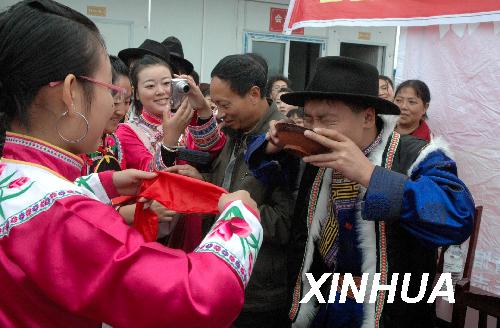 10月29日,新街社區(qū)居民在北川縣曲山鎮(zhèn)永興板房區(qū)聯(lián)歡。 當日是羌歷新年,在四川省北川,羌族群眾身著節(jié)日盛裝,度過震后第一個羌歷新年。 新華社記者 白瀛 攝