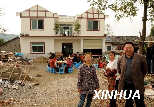 11月16日,四川省安縣花街鎮(zhèn)雍峙村村民張學鐘(右一)和妻子(右二)在自己剛剛建起的新房前。張學鐘家原來300多平方米的房子在地震中全部倒塌,他用近年打工的積蓄,加上國家補貼和貸款,新建了這幢近300平方米的新房。 四川地震災(zāi)區(qū)群眾自籌資金,并在政府補貼和貸款政策的幫助下,積極開展災(zāi)后重建,許多地方已經(jīng)矗立起一幢幢新房。 新華社記者陳燮攝