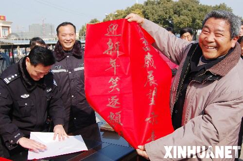 1月11日,一名返鄉(xiāng)農(nóng)民工展示蕪湖交警贈送的春聯(lián)。當(dāng)日是全國春運啟動第一天,安徽省蕪湖市交警支隊組織交警書畫愛好者來到蕪湖汽車站,為返鄉(xiāng)乘客義務(wù)書寫春聯(lián)、“!弊珠T貼,送去平安祝福。新華社發(fā)