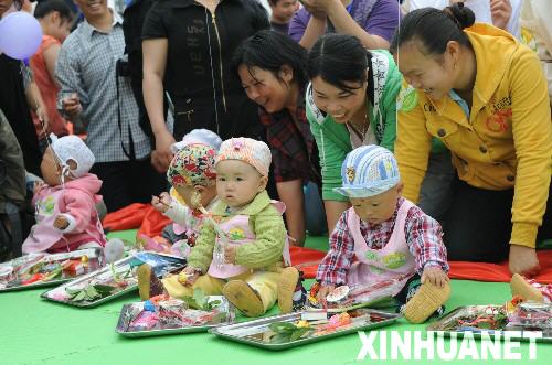 2009年5月13日 108個(gè)地震“羅漢娃”舉行生日抓周會(huì) 5月13日,地震“羅漢娃”正在抓周。 2008年5月12日,汶川大地震發(fā)生后,四川省什邡市婦幼保健院被震成危房,相鄰的千年古剎羅漢寺當(dāng)天收留了將要臨產(chǎn)的全部孕婦。羅漢寺內(nèi),禪床變產(chǎn)床,廚房成產(chǎn)房,從5月13日清晨到8月7日什邡市婦幼保健院板房區(qū)建好的兩個(gè)多月里,羅漢寺內(nèi)先后誕生了108個(gè)孩子,他們被人們親切地稱為“羅漢娃”。2009年5月13日,在什邡市剛剛落成的由北京援建的北京小學(xué)操場(chǎng)上,108個(gè)“羅漢娃”舉行了集體生日抓周活動(dòng)。許多愛心人士不遠(yuǎn)千里來到現(xiàn)場(chǎng),與寶寶們結(jié)對(duì),拜認(rèn)干爹干媽。