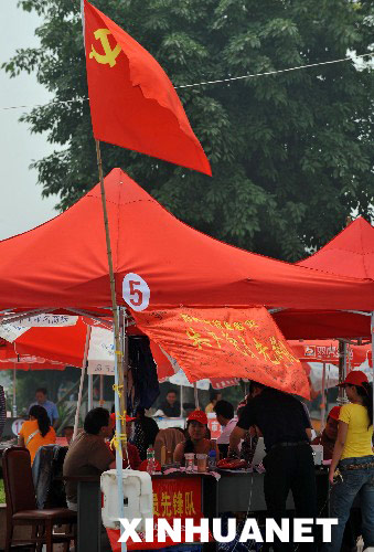 在彭州市一共產(chǎn)黨員先鋒隊報名處,黨旗在上空飄揚(yáng)(5月23日攝)。四川大地震發(fā)生后,鮮艷的紅旗飄揚(yáng)在災(zāi)區(qū)各處。各級黨團(tuán)組織活躍在救災(zāi)一線。新華社記者 郝同前 攝(資料圖片)