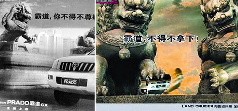 。ㄗ螅┌袊(guó)傳統(tǒng)石獅子向奔馳的汽車抬起右爪做敬禮狀的豐田普拉多的廣告。(右)中國(guó)網(wǎng)民稱該廣告觸碰了中國(guó)人的自尊心,并制作了與之抗衡對(duì)的廣告,內(nèi)容是石獅子用腳踩住普拉多的場(chǎng)面。