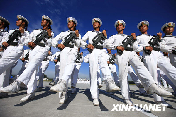 海軍水兵方隊在烈日下進行嚴(yán)格訓(xùn)練(9月13日攝)。新中國成立60周年國慶閱兵式即將來臨,練兵場上的受閱官兵們精神飽滿、氣勢昂揚,他們在訓(xùn)練中精雕細(xì)刻,科學(xué)訓(xùn)練,決心以最嚴(yán)整的軍姿接受檢閱。新華社記者查春明攝