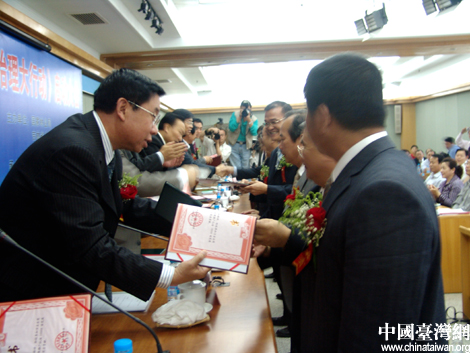 與會領(lǐng)導(dǎo)向臺商頒發(fā)認(rèn)治土地的榮譽(yù)證書