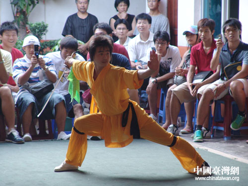 中國臺(tái)灣網(wǎng)8月10日福建莆田消息 首屆兩岸青年聯(lián)歡節(jié)“海峽西岸青年歡樂行”莆田參觀考察組因受到“寶霞”、“桑美”兩臺(tái)風(fēng)的影響,在上午取消了赴湄洲島參訪祭拜媽祖祖廟活動(dòng)。在莆田市接待工作組及臺(tái)灣十杰青年基金會(huì)的協(xié)調(diào)安排下,參觀南少林,觀看少林武術(shù)的表演成為昨天下午的新內(nèi)容。