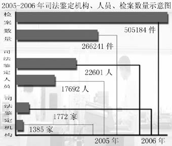 據(jù)司法部司法鑒定管理局統(tǒng)計(jì):2005年,除西藏自治區(qū)外,全國(guó)審核登記的法醫(yī)類、物證類、聲像資料(含計(jì)算機(jī)司法鑒定、電子物證司法鑒定)司法鑒定機(jī)構(gòu)共1385個(gè),至2006年底增至1772個(gè),增長(zhǎng)率為27.9%;執(zhí)業(yè)司法鑒定人共17692人,至2006年底增至22601人,增長(zhǎng)率為27.7%;司法鑒定業(yè)務(wù)的檢案數(shù)量為266241件,至2006年增至505184件,增長(zhǎng)率為89.7%。