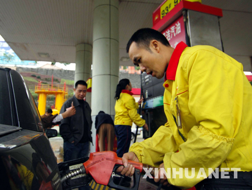 11月1日,重慶一家加油站的工作人員正在給一輛汽車加油。10月31日,國家發(fā)展和改革委員會發(fā)出通知,決定自11月1日零時起調整成品油價格。本次汽油、柴油和航空煤油價格每噸各提高500元。(新華社記者劉潺攝)