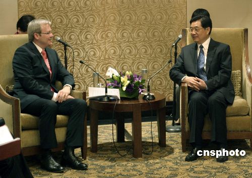 資料圖:2007年9月7日,中國國家主席胡錦濤在悉尼會見澳大利亞反對黨領(lǐng)袖陸克文。 中新社發(fā) 賴海隆 攝
