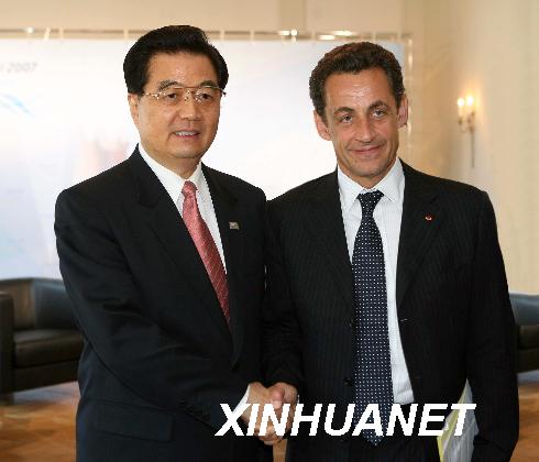2007年6月8日,國(guó)家主席胡錦濤在德國(guó)海利根達(dá)姆會(huì)見(jiàn)法國(guó)總統(tǒng)薩科齊。新華社記者劉建生攝