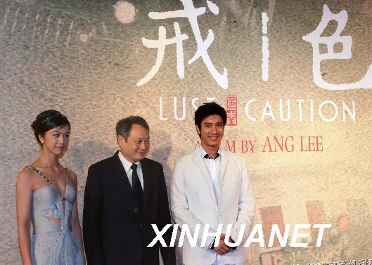 2007年10月31日晚,導(dǎo)演李安(中)和演員湯唯(左)、王力宏在首映禮上。當(dāng)晚,電影《色·戒》在上海影城舉行內(nèi)地首映禮。新華社記者劉穎攝