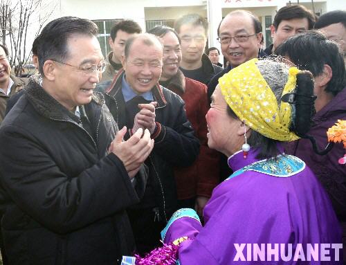 元旦來臨之際,中共中央政治局常委、國(guó)務(wù)院總理溫家寶來到陜西農(nóng)村和企業(yè)看望、慰問廣大干部群眾,向大家致以新年的問候。這是12月29日,溫家寶在西安市閻良區(qū)井家村看望村民時(shí)與扭秧歌的老人交談。 新華社記者姚大偉攝