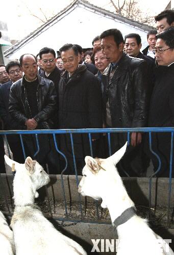 元旦來臨之際,中共中央政治局常委、國(guó)務(wù)院總理溫家寶來到陜西農(nóng)村和企業(yè)看望、慰問廣大干部群眾,向大家致以新年的問候。這是12月29日,溫家寶在富平縣王寮鎮(zhèn)雙楊村看望奶山羊養(yǎng)殖戶。 新華社記者姚大偉攝