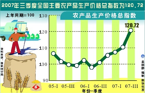 圖表:2007年三季度全國主要農(nóng)產(chǎn)品生產(chǎn)價(jià)格總指數(shù)為120.72 新華社發(fā)