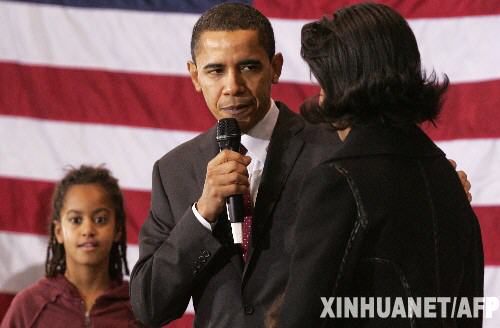 1月1日,在美國(guó)艾奧瓦州的得梅因,美國(guó)民主黨總統(tǒng)競(jìng)選人巴拉克·奧巴馬(中)一家一起參加競(jìng)選集會(huì)。美國(guó)總統(tǒng)選舉黨內(nèi)初選即將于1月3日在艾奧瓦州開鑼,民主黨和共和黨將分別舉行基層黨員會(huì)議,推舉參加高級(jí)黨員會(huì)議的代表,以選擇本黨總統(tǒng)候選人。 新華社/法新