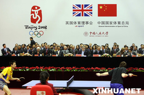 1月18日,中國國務(wù)院總理溫家寶和來訪的英國首相布朗來到北京中國人民大學,觀看中英兩國運動員乒乓球比賽。新華社記者 劉衛(wèi)兵攝
