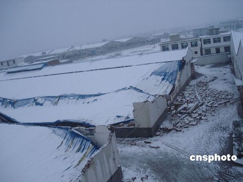 1月19日,由于連降暴雪,安徽合肥瑤海區(qū)工業(yè)園5000多平方米倉(cāng)庫(kù)廠房被積雪壓塌,所幸沒(méi)有造成人員傷亡。據(jù)悉,該工業(yè)園已免費(fèi)提供2萬(wàn)平方米標(biāo)準(zhǔn)倉(cāng)庫(kù),在確保安全的情況下,預(yù)計(jì)1月20日組織拆遷隊(duì)伍扒開屋頂,推倒墻壁,把被埋物資全部轉(zhuǎn)移。 中新社發(fā) 何保豐 攝