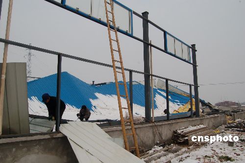 1月23日,安徽含山宏記精工鑄件廠的工人正在清理被大雪壓垮的廠房。從1月14日開(kāi)始,安徽含山境內(nèi)普降中到大雪。據(jù)不完全統(tǒng)計(jì),該縣受災(zāi)人口達(dá)6800人,農(nóng)作物受災(zāi)面積800公頃,居民和企業(yè)倒塌或損壞的房屋200多間,直接經(jīng)濟(jì)損失超過(guò)1000萬(wàn)元。目前該縣正組織多部門(mén)開(kāi)展自救。 中新社發(fā) 田斌峰 攝