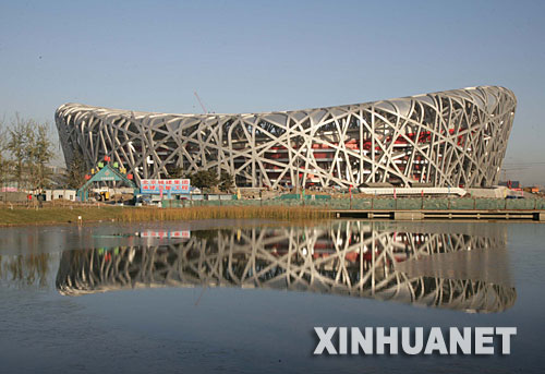 “鳥巢”倒映在水中。北京2008年奧運(yùn)會(huì)主會(huì)場――國家體育場(“鳥巢”)鋼筋混凝土結(jié)構(gòu)、鋼結(jié)構(gòu)、膜結(jié)構(gòu)三大結(jié)構(gòu)工程日前完工,并開始安裝座椅。 新華社發(fā)