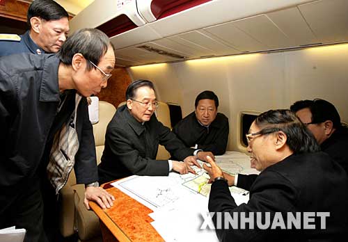 1月28日20時30分,中共中央政治局常委、國務院總理溫家寶從北京趕赴湖南,考察抗冰救災工作。這是溫家寶總理1月28日夜在專機上與國務院有關部門負責人研究抗冰救災工作。 新華社記者姚大偉攝