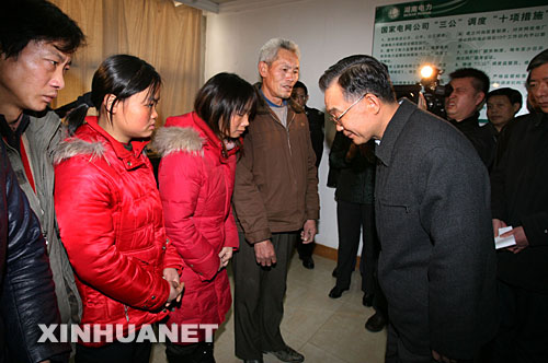 1月29日,中共中央政治局常委、國務院總理溫家寶在湖南長沙看望在沙坪變電站除冰搶險中不幸殉職的周景華、羅長明、羅海文3名電力職工的家屬。溫家寶總理說:“今天面對你們,我無法用更多的語言來表示安慰,我給你們鞠個躬吧!” 新華社記者 姚大偉 攝