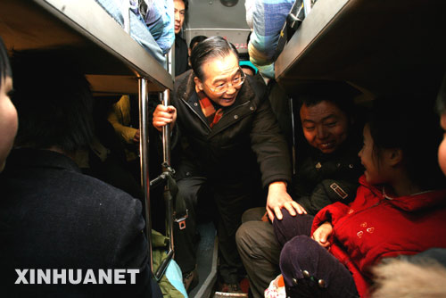 1月29日,中共中央政治局常委、國務院總理溫家寶在京珠高速察看高速公路堵車情況。在京珠高速湘潭段,南下廣東的車輛排著幾十公里的長龍。溫家寶總理親自登上一輛客車慰問被困乘客。 新華社記者姚大偉攝