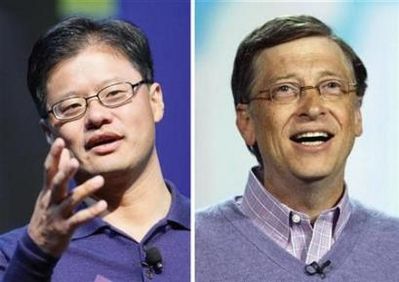 左為雅虎創(chuàng)辦人及現(xiàn)任CEO楊致遠(yuǎn),右為微軟董事長比爾·蓋茨