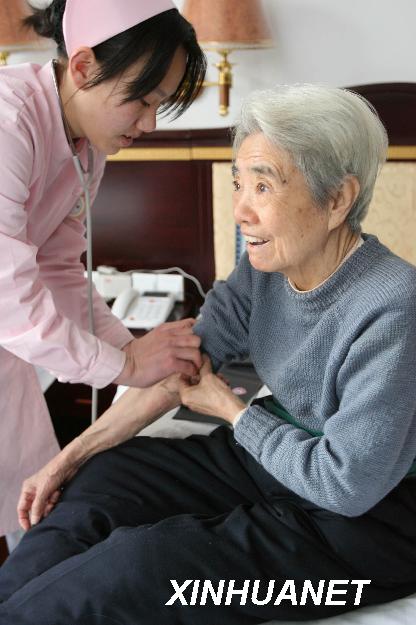 圖片說明:1月25日,在養(yǎng)老基地頤年山莊內,一名護理員在為一位退休老人測量血壓。近日,中國資產經(jīng)營管理公司利用央企閑置資產改造建立的首家養(yǎng)老基地――城通頤年山莊在北京落成,并迎來了首批來此居住養(yǎng)老的退休老人。2007年6月,在軍工企業(yè)改制和社會老齡化的大背景下,中資公司投資3000萬元,將閑置多年的北京燕京汽車廠一分廠舊廠房加以改造,發(fā)展養(yǎng)老產業(yè),并積極探索多種養(yǎng)老模式。此舉既盤活了企業(yè)資產,又為社會養(yǎng)老開辟了新路子。(新華社記者 李明放 攝)