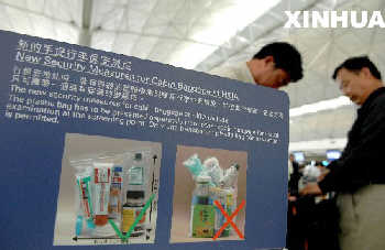 。ㄙY料圖)2007年3月21日, 香港機(jī)場(chǎng)管理局在客運(yùn)大樓貼出新保安措施的告示。當(dāng)日,香港國(guó)際機(jī)場(chǎng)實(shí)施新保安措施,所有離港及轉(zhuǎn)機(jī)旅客只能隨身攜帶容量不超過100毫升的液體、凝膠及噴霧物品,并須放在一個(gè)密封的透明膠袋內(nèi)。 新華社記者呂小煒攝