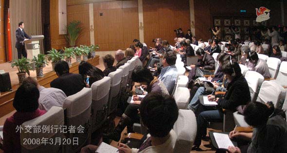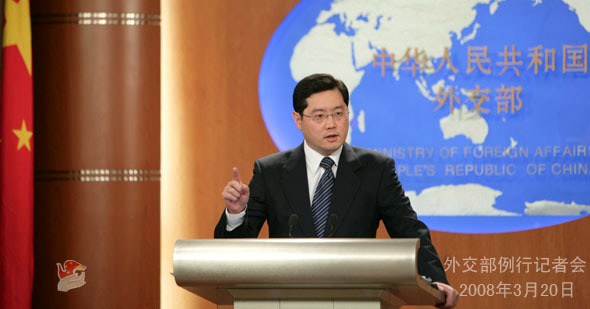 2008年3月20日下午,外交部發(fā)言人秦剛舉行例行記者會(huì),就近期拉薩發(fā)生的打砸搶燒嚴(yán)重暴力犯罪事件等問題答問。