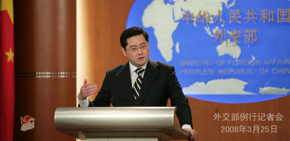 2008年3月25日下午,外交部發(fā)言人秦剛舉行例行記者會(huì),就近期拉薩發(fā)生的打砸搶燒嚴(yán)重暴力犯罪事件等問題答問。