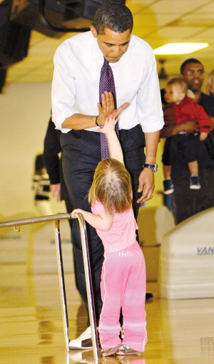3月29日,奧巴馬與一名5歲的小支持者玩擊掌游戲。