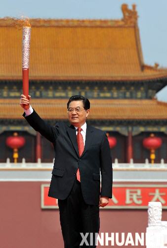 3月31日,中共中央總書記、國家主席胡錦濤出席北京2008年奧運圣火歡迎儀式暨火炬接力啟動儀式。這是胡錦濤點燃圣火盆后,高高舉起奧運火炬,向現(xiàn)場的中外來賓和各界群眾致意。 新華社記者樊如鈞攝