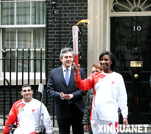 4月6日,在首相府前,第34棒火炬手、英國田徑名將丹尼斯·劉易斯(右一)展示火炬。英國首相布朗(左二)、第35棒火炬手阿里·賈瓦德(左一)等一同觀看。當日,北京奧運會圣火傳遞活動在英國倫敦舉行,這是北京奧運會圣火境外傳遞的第四站。 新華社記者謝秀棟攝