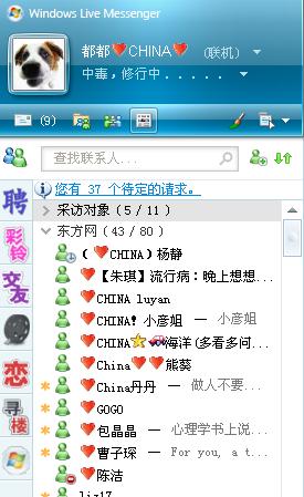 昨天一上班,在外企工作的鄭小姐習(xí)慣性地打開MSN,突然發(fā)現(xiàn)好友列表上的名單“祖國山河一片紅”——好幾個(gè)朋友的名字前都掛著一個(gè)小紅心和“CHINA”的字樣,將自己的名字改成愛國簽名的方法也在MSN上如同火炬一樣被傳遞著(見圖)。MSN中國公司相關(guān)負(fù)責(zé)人昨天告訴記者,這一做法并非MSN發(fā)起,完全是網(wǎng)友的自發(fā)行動(dòng)。截止到昨天下午5時(shí),亮起紅心簽名的MSN用戶總數(shù)已達(dá)200萬人。