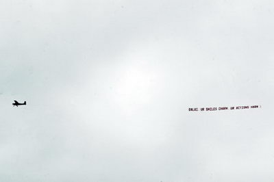 4月14日,西雅圖上空飛機(jī)拖出抗議標(biāo)語:“達(dá)賴:你的微笑很吸引人,但是你的行動很傷害人。”(Dalai: your smiles charm but your actions harm)