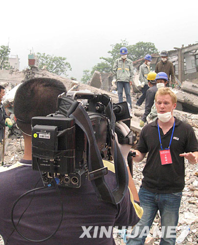5月17日,一名外國記者(前右)在北川中學(xué)廢墟上進(jìn)行現(xiàn)場報(bào)道。 新華社記者 徐壯志 攝