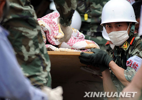 5月15日,消防戰(zhàn)士在四川省什邡市鎣華鎮(zhèn)云峰化工廠倒塌的宿舍樓廢墟中營救出一名生還者。新華社記者 姜帆 攝