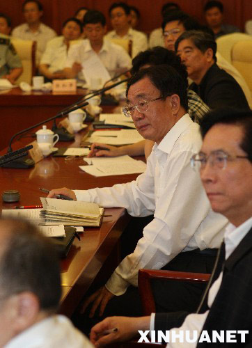 5月19日,受胡錦濤總書記委托,中共中央政治局常委、中央紀(jì)委書記賀國強(qiáng)趕赴重慶察看地震災(zāi)情,慰問受災(zāi)干部群眾,看望奮戰(zhàn)在抗震救災(zāi)第一線的部隊(duì)官兵、公安民警和醫(yī)護(hù)人員,指導(dǎo)協(xié)調(diào)抗震救災(zāi)工作。 這是賀國強(qiáng)聽取重慶抗震救災(zāi)工作簡要匯報,與大家共同研究探討以后的救災(zāi)工作。 新華社記者劉衛(wèi)兵攝