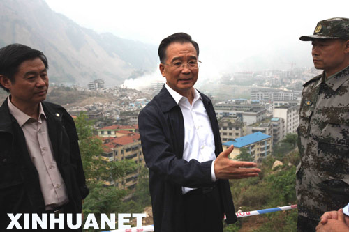 5月22日,中共中央政治局常委、國(guó)務(wù)院總理、國(guó)務(wù)院抗震救災(zāi)總指揮部總指揮溫家寶重返四川重災(zāi)區(qū)北川考察。溫家寶來(lái)到北川縣城外的一塊高地上,察看這座在地震中遭受嚴(yán)重破壞的城鎮(zhèn)。他對(duì)當(dāng)?shù)馗刹空f(shuō),我們要再造一個(gè)新北川。 新華社記者 姚大偉 攝