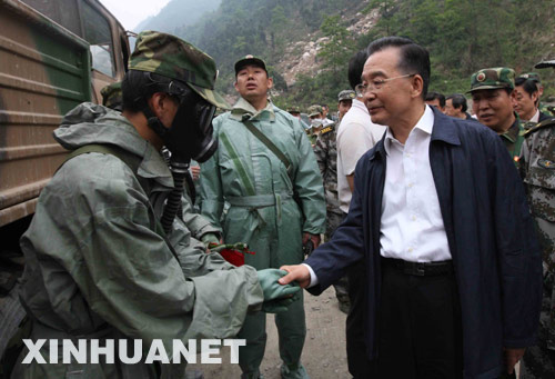 這是溫家寶和在北川縣城執(zhí)行防疫任務(wù)歸來(lái)的戰(zhàn)士握手。 新華社記者 姚大偉 攝
