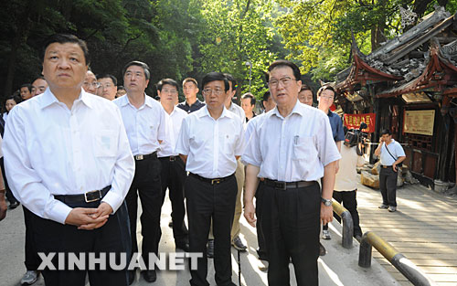 這是6月3日,李長(zhǎng)春在都江堰察看在地震中受損嚴(yán)重的世界文化遺產(chǎn)都江堰二王廟。新華社記者李學(xué)仁攝