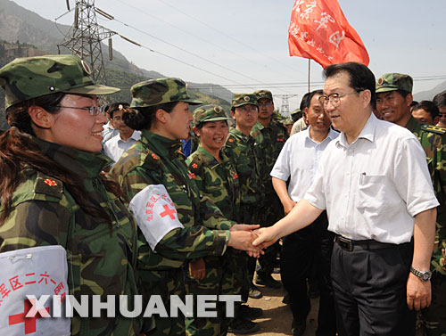 這是6月3日,李長(zhǎng)春在四川汶川縣映秀鎮(zhèn)看望慰問來自北京軍區(qū)的醫(yī)務(wù)工作者。新華社記者李學(xué)仁攝