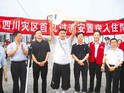 6月4日下午,北京援建的綿陽(yáng)花荄過渡房——京安小區(qū)迎來了首批住戶。記者在過渡房8組01號(hào),見到戶主趙倫全,他家幸存的五口人,全部住進(jìn)過渡房。趙倫全說,他是茶坪鄉(xiāng)人,地震使他家房屋變成一堆廢墟。在地震后的20多天里,他先后住過茶坪、綿陽(yáng)九洲體育廣場(chǎng)、人民公園、制藥廠等6個(gè)地方的抗震棚。他說:“現(xiàn)在好了,我們住進(jìn)了北京為我們修建的過渡房,可以安安心心住上幾年了。”