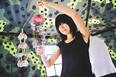 圖③:6月4日,第一個(gè)搬入“藍(lán)天新村”的四川什邡市湔氐鎮(zhèn)龍居村九組村民劉山正在帳篷中懸掛從廢墟中挖出來的風(fēng)鈴?战当巢吭ǖ挠150個(gè)帳篷組成的“藍(lán)天新村”完工,新村按照每家每戶有廚房、有衛(wèi)生間、有水、有電等“八有”標(biāo)準(zhǔn)建設(shè)。張東賀攝