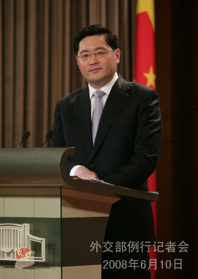 2008年6月10日,外交部發(fā)言人秦剛舉行例行記者會(huì),就聯(lián)合國(guó)秘書(shū)長(zhǎng)潘基文將訪華、朝日將舉行雙邊會(huì)談、蘇丹副總統(tǒng)塔哈訪華等問(wèn)題回答了記者提問(wèn)。