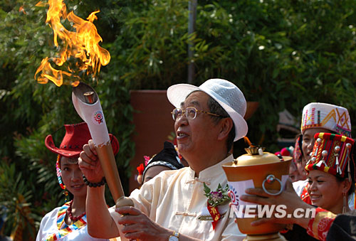 6月11日,全國人大常委會原副委員長許嘉璐點(diǎn)燃“中華56民族之歌”音樂火炬。