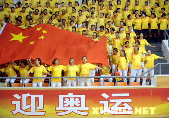 7月5日,拉拉隊在看臺上吶喊助威。當(dāng)日,“微笑北京、志愿奧運、共創(chuàng)和諧——北京奧運會、殘奧會拉拉隊大賽”在北京門頭溝體育館舉行。新華社記者羅曉光攝