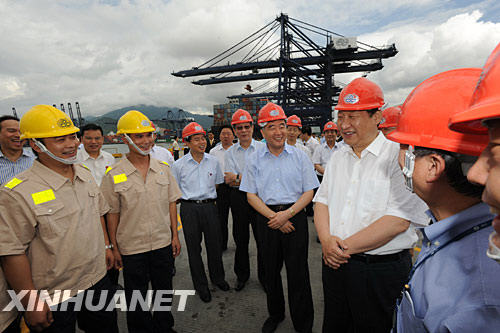 7月4日至5日,中共中央政治局常委、中央書記處書記、國家副主席習近平在廣東考察工作。這是7月5日,習近平在鹽田國際集裝箱碼頭看望現(xiàn)場工作人員。 新華社記者 黃敬文 攝