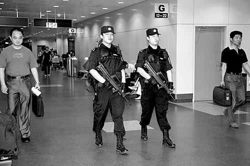 持槍武裝特警開(kāi)始在首都機(jī)場(chǎng)各航站樓進(jìn)行巡邏。資料圖片