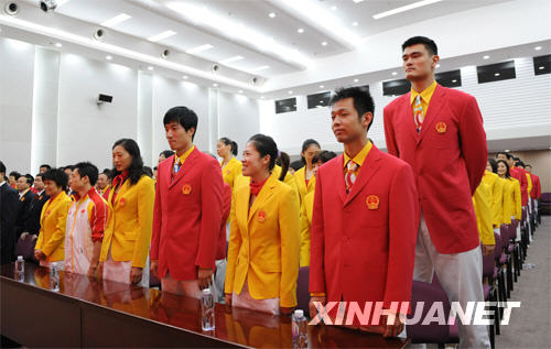 這次的中國(guó)奧運(yùn)軍團(tuán)成立大會(huì)和以往有明顯不同,增加了宣誓。包括劉翔、姚明和許多奧運(yùn)冠軍在內(nèi)的運(yùn)動(dòng)員,身穿佩帶國(guó)徽的奧運(yùn)隊(duì)服,面對(duì)一面巨大的國(guó)旗高唱國(guó)歌,然后在劉鵬的帶領(lǐng)下向祖國(guó)和人民莊嚴(yán)宣誓:“為了祖國(guó)的榮譽(yù),我將在北京奧運(yùn)會(huì)上頑強(qiáng)拼搏,奮勇?tīng)?zhēng)先;團(tuán)結(jié)友愛(ài),公平競(jìng)爭(zhēng);賽出風(fēng)格,賽出水平;尊重對(duì)手,尊重裁判,尊重觀眾;堅(jiān)決反對(duì)興奮劑,干干凈凈參加奧運(yùn)會(huì);取得運(yùn)動(dòng)成績(jī)和精神文明雙豐收,為人生添彩,為奧運(yùn)增輝!為民族爭(zhēng)氣,為祖國(guó)爭(zhēng)光!”